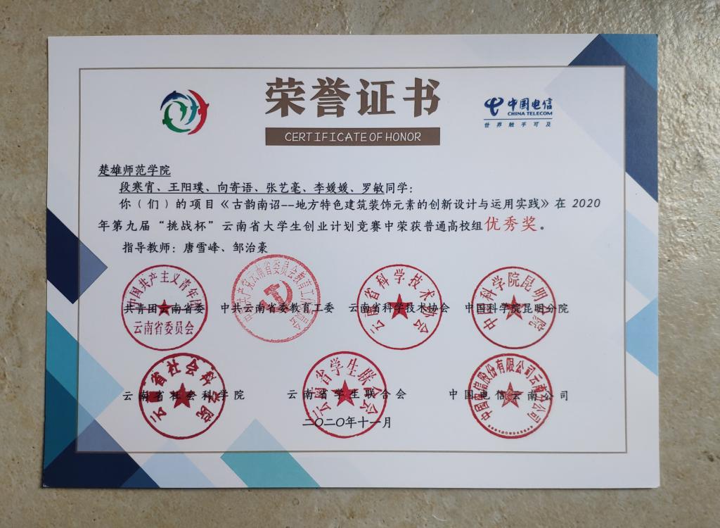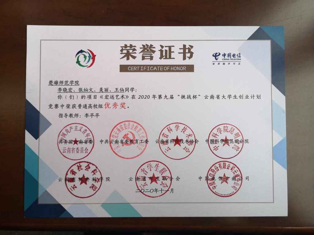 我院创新创业工作取得新的成绩。“这些年,即将遗失的彩绘文化”在“翰文杯”第六届云南省“互联网+”大学生创新创业大赛(主赛道)中荣获金奖。“宏远艺术”和“古韵南诏--地方特色建筑装饰元素的创新设计与运用实践”两个项目荣获2020年第九届“挑战杯”云南省大学生创业计划竞赛优秀奖。