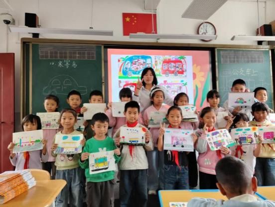 小学阶段以“激发兴趣、培养习惯”为目标,课程设计注重趣味性与实践性结合。香水小学白燕课程覆盖一、二、六年级,先后开展 《变色龙》《变幻般的色》等课程,其中《变色龙》引导学生用色表现动物保护色特性,《梦幻般的色》通过混色实验探索色渐色美感;同步借助艺术走廊举办“彩云和桥”“泡泡乐”“七彩飞虹” 等班级画展,让学生在创作与展示中收获成就感。近城小学李先运聚焦学生空间思维与观察能力培养,为五年级授《搭建框架》课程,指导学生用木棒、橡皮泥搭建立体果篮,理解结构力学原理;为四年级开设《色彩对印》《窗口》等课程,前者通过对折、按压画纸探索色彩肌理,后者引导学生以“窗口”为取景框,学习构图与透视表现。插甸学校梁录旭围绕拼贴画、简笔画、环保主题绘画展开教学,从理论讲解到实践操作层层递进,指导学生完成“保护环境”“校园生活”等主题作品。思源学校李奇娟以“合作创作”为核心,带领一年级学生共创变美丽的田野《通过黑板集体绘画培养协作能力;王德琴的二年级5个班与三年级 1个班,开展变泡泡乐《变纸纸事事》等课程,其中《泡泡乐》借助阳光折射讲解色彩化,《剪纸故事》融入传统手工技艺。